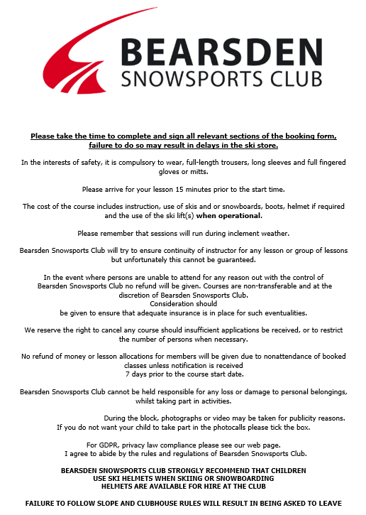 In the event where persons are unable to attend for any reason out with the control of Bearsden Ski Club, no refund will be due. Consideration should be given to ensure that adequate insurance is in place for such eventualities. We reserve the right to cancel any courses should insufficient applications be received, or to restrict the number of persons if necessary.